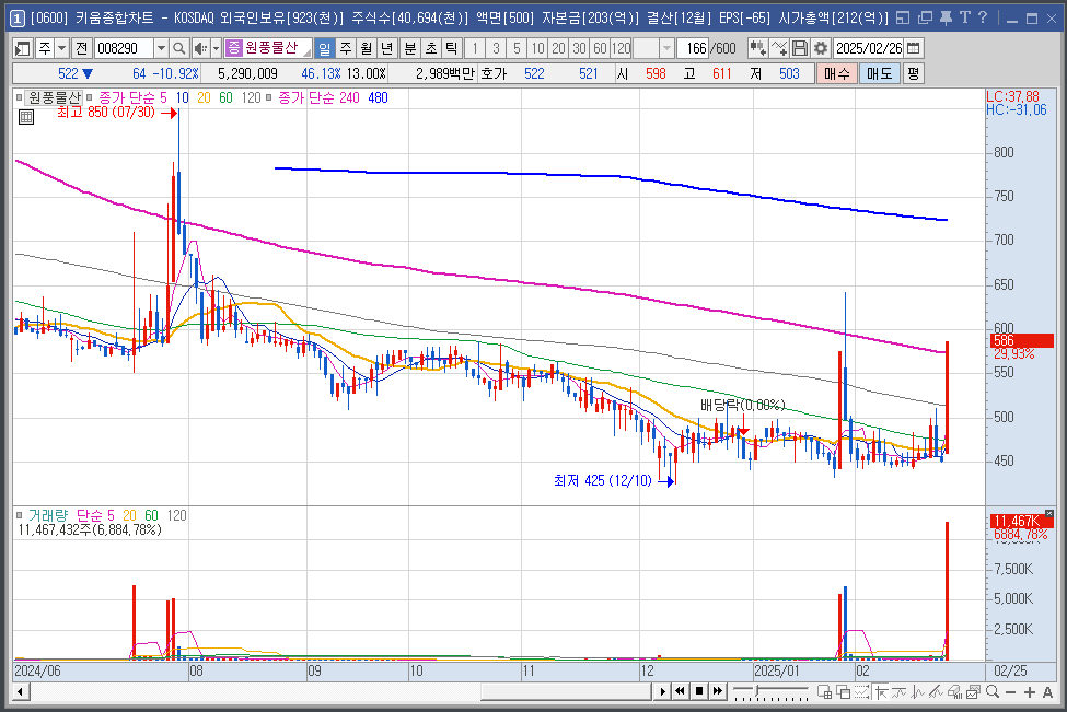 2025년 2월 25일, 원풍물산의 주가는 전일 대비 약 29.93% 상승하며 상한가를 기록했습니다.