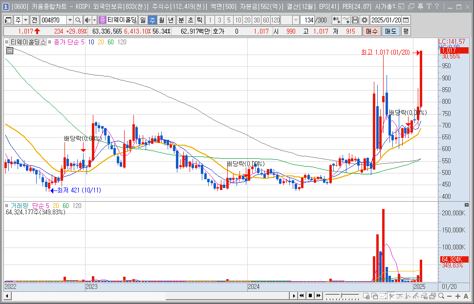 1월 21일, 티웨이홀딩스의 주가는 자회사 티웨이항공의 실적 개선 기대감으로 인해 급등했습니다.