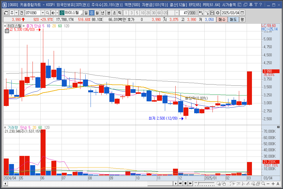 주가 급등에는 여러 가지 요인이 복합적으로 작용했으며, 이를 통해 하이스틸의 향후 성장 가능성에 대한 시장의 기대가 커졌습니다.
