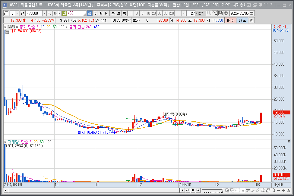 2025년 3월 6일, M83의 주가는 전 거래일 대비 29.97% 상승하며 상한가를 기록했다.