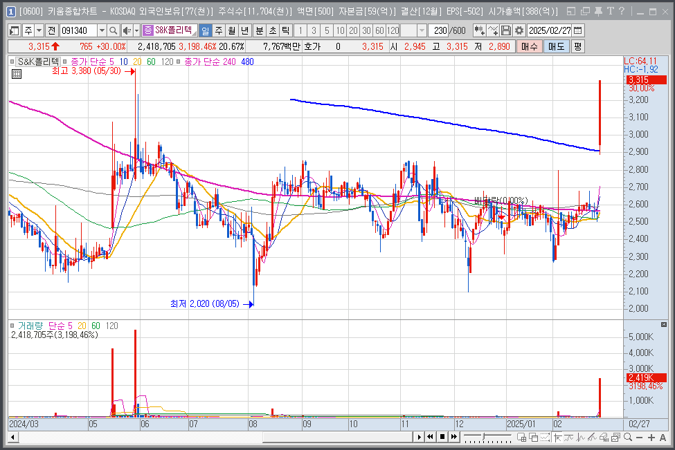 2025년 2월 27일, SK폴리텍의 주가는 전일 대비 30% 급등하며 상한가를 기록했습니다. 주가는 3,315원으로 마감되었으며, 이 같은 급등의 배경에는 여러 가지 요인이 작용한 것으로 분석됩니다.
